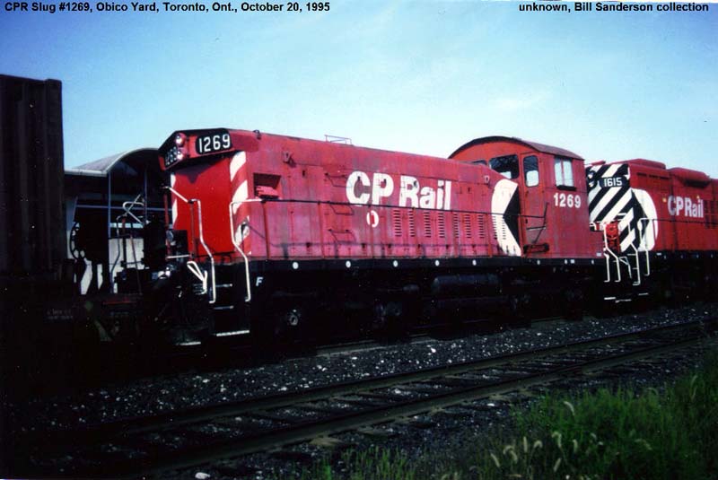 Other Photos (chronological) : 1. CP 8169, painted in the CP Rail Multimark paint scheme. Photographer, date and location unknown. From the Mike McMahon collection; 2. CP 1269 at Toronto, ON., converted to Slug, painted in the CP Rail Multimark paint scheme. Photographer unknown, 1995. From the Bill Sanderson collection; 3. CP 1022 at Smiths Falls, ON., converted to Slug #1022, painted in the CP Rail Multimark paint scheme. Photo by Bill Sanderson, 1997.