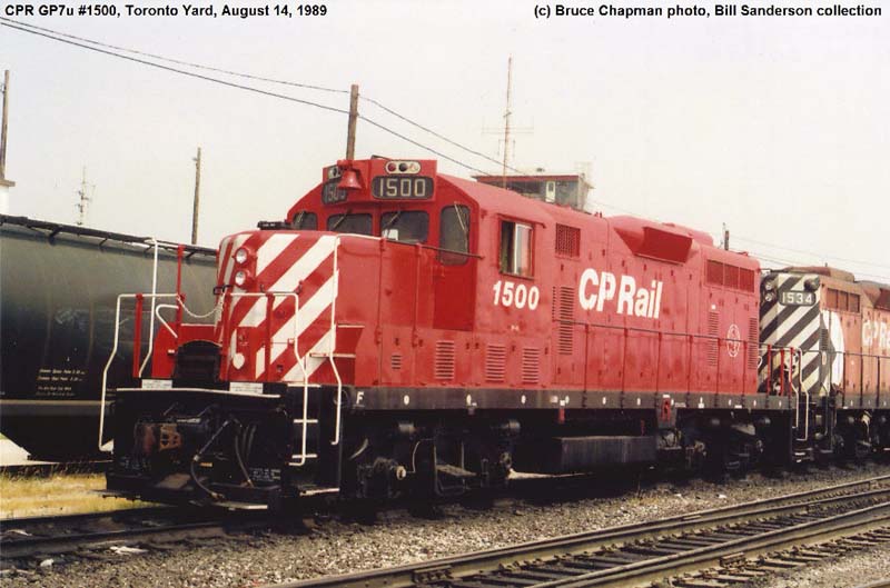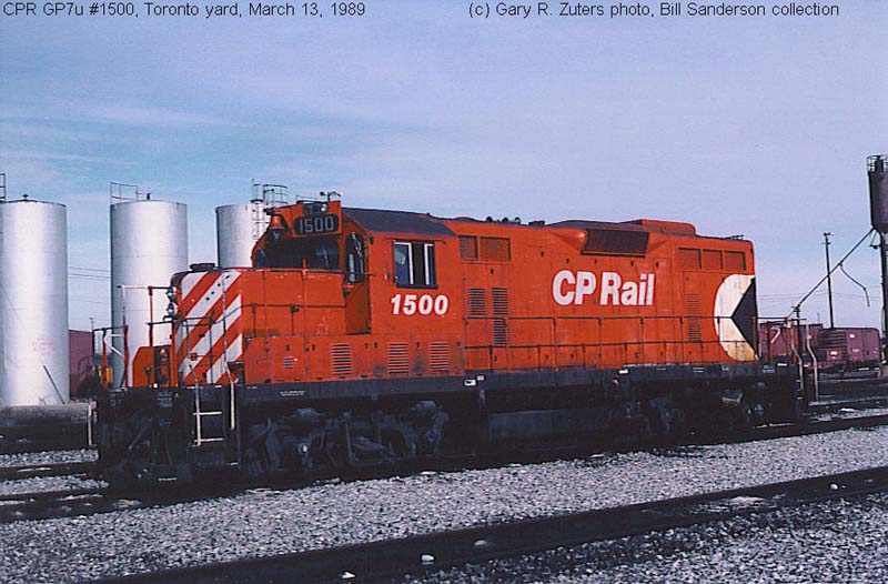 Notes : Built by GMD as GP7 #8412 (1953). Rebuilt by CP as GP7u, chop-nosed and renumbered to #1500 (1980). Wrecked at Toronto, ON. (5/1991), retired. ___________________________________________________________________________________________