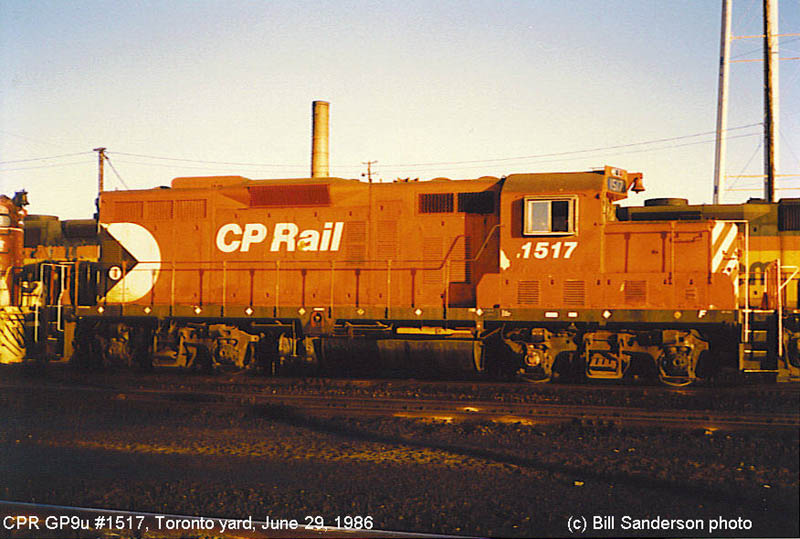 Notes : Built by GMD as GP9 #8486 (1954). Rebuilt by CP as GP9u, chop-nosed and renumbered to #1517 (1981). Wrecked at Toronto, ON. (1991), retired. ___________________________________________________________________________________________