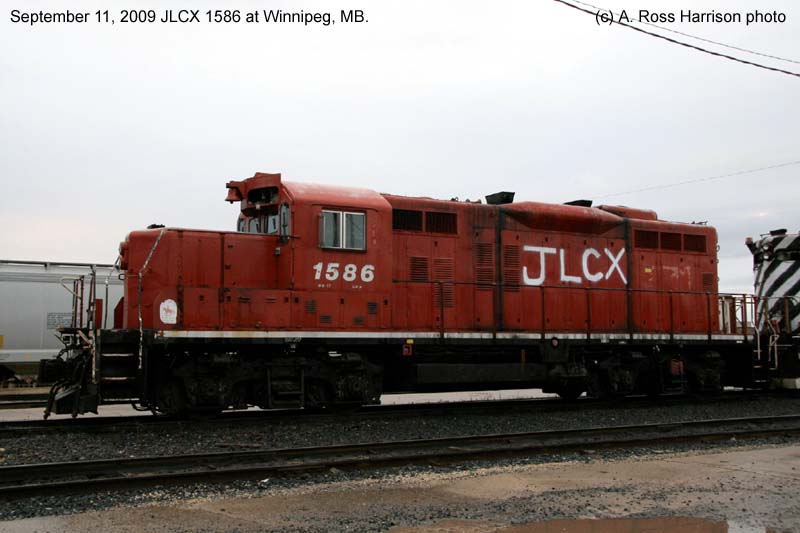 Other Photos (chronological) : 1. CP 8501 at Port Coquitlam, B.C., painted in the CP Rail Small Multimark paint scheme. Photo by Claude Prutton, 1979; 2. CP 1586 at Winnipeg, MB., painted in the CP Rail Small Multimark paint scheme. Photo by Bill Sanderson, 1992; 3. CP 1586 at Winnipeg, MB., painted in the CP Rail paint scheme. Photo by A. Ross Harrison, 2007; 4. CP 1586 at Winnipeg, MB., painted in the CP Rail paint scheme. Photo by A. Ross Harrison, 2008; 5. JLCX 1586 at Winnipeg, MB., painted in the Ex-CP Rail paint scheme. Photo by A. Ross Harrison, 2009; 6. JLCX 1586 at Alyth, Calgary AB., painted in the Ex-CP Rail paint scheme. Photo by Doug MacKenzie, 2009.
