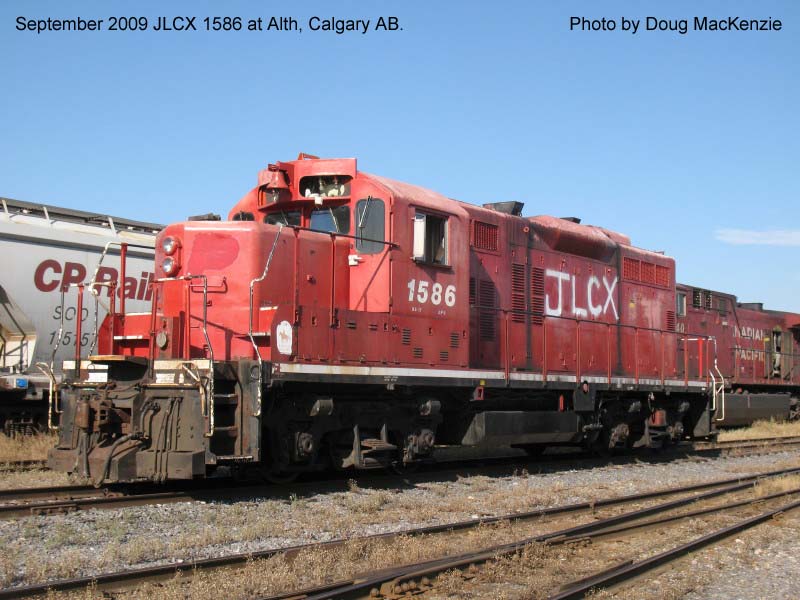 Notes : Built by GMD as GP9 #8501 (1955). Rebuilt by CP as GP9u, chop-nosed and renumbered to #1586 (1984). Retired (11/20/2008). Sold to Rail & Motor International (RIMX) for parts (5/2009). Resold to J&L Consulting, became JLCX #1586. Waybilled to Railserve, Stettler AB. ___________________________________________________________________________________________