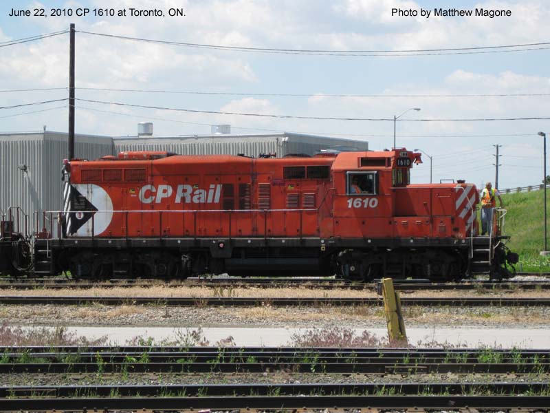 Notes : Built by GMD as GP9 #8675 (1957). Rebuilt by CP as GP9u, chop-nosed and renumbered to #1610 (1985). Equipped with CANAC remote control 'beltpack' equipment. Mated with Slug #1023. Retired (9/26/2012). Sent to SRY, New Westminster B.C., for parts salvage and scrapping. ___________________________________________________________________________________________