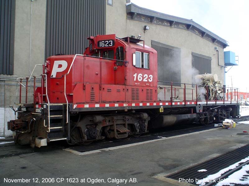 Other Photos (chronological) : 1. CP 8525 at Vancouver, B.C., painted in the CP Rail Large Multimark paint scheme. Photo by Claude Prutton, 1979; 2. CP 1623 at Alyth, Calgary AB., painted in the CP Rail Small Multimark paint scheme. Photo by Bill Sanderson, 1993; 3. CP 1623 at Alyth, Calgary AB., painted in the CP Rail Small Multimark paint scheme. Photo by E.D. Motis, 1995; 4. CP 1623 at Ogden, Calgary AB., with it's hood removed, painted in the CP Rail paint scheme. Photo by Mark Johnson, 2006.