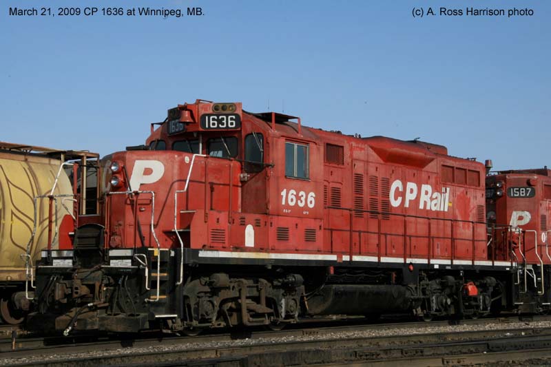 Notes : Built by GMD as GP9 #8806 (1958). Rebuilt by CP as GP9u, chop-nosed and renumbered to #1636 (1986). Equipped with CANAC remote control 'beltpack' equipment. Retired (3/28/2012). Sent to SRY, New Westminster B.C., for parts salvage and scrapping. ___________________________________________________________________________________________