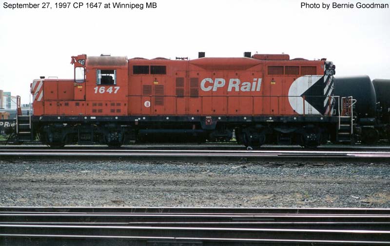 Other Photos (chronological) : 1. CP 8707 at Vancouver, B.C., painted in the CP Rail Small Multimark paint scheme. Photo by Claude Prutton, 1976; 2. CP 1647 at Winnipeg, MB., painted in the CP Rail Small Multimark paint scheme. Photo by Bill Sanderson, 1997; 3. CP 1647 at Winnipeg, MB., painted in the CP Rail Small Multimark paint scheme. Photo by Bernie Goodman, 1997; 4. CP 1647 at Alyth, Calgary AB., painted in the Canadian Pacific paint scheme. Photo by Cor van Steenis, 2008.