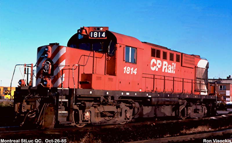 Built by : MLW Built in : 1958 as CP 8767 Serial Number : 82448 Class : DRS-18 Paint Scheme : CP Rail Large Multimark This Photo : Ron Visockis, 1985