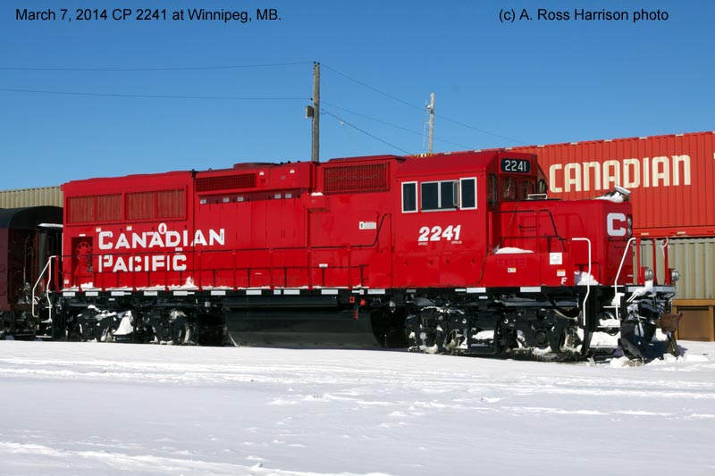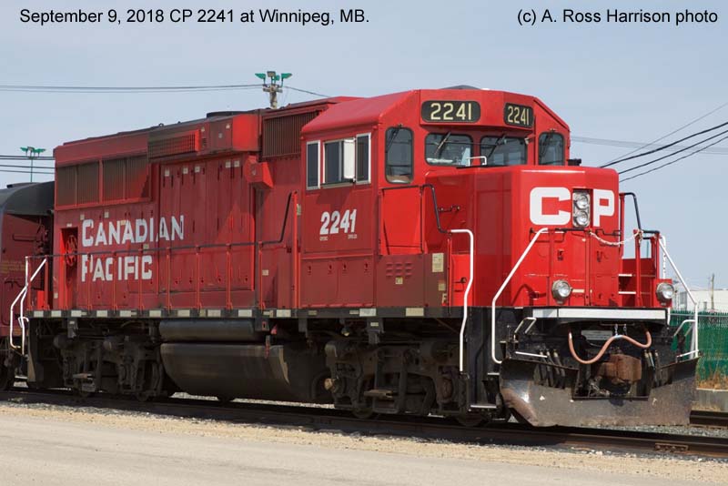 Other Photos (chronological) : 1. CP 2241 at Winnipeg, MB., painted in the Canadian Pacific paint scheme. Photo by A. Ross Harrison, 2014; 2. CP 2241 at Winnipeg, MB., painted in the Canadian Pacific paint scheme. Photo by A. Ross Harrison, 2018.