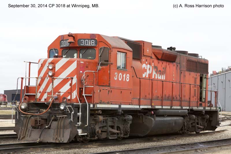 Other Photos (chronological) : 1. CP 3018 at Alyth, Calgary AB., painted in the CP Rail Large Multimark paint scheme. Photographer unknown, 1974. From the Bill Sanderson collection; 2. CP 3018 at Port Coquitlam, B.C., painted in the CP Rail Small Multimark (experimental) paint scheme. Photo by Claude Prutton, 1977; 3. CP 3018 at Superior, WI., painted in the CP Rail no-Multimark paint scheme. Photo by Bryan Martyniuk, 2009; 4. CP 3018 at Winnipeg, MB., painted in the CP Rail no-Multimark paint scheme. Photo by A. Ross Harrison, 2014; 5. CP 3018 at Winnipeg, MB., painted in the CP Rail no-Multimark paint scheme. Photo by A. Ross Harrison, 2014; 6. CP 3018 at Winnipeg, MB., painted in the CP Rail no-Multimark paint scheme. Photo by A. Ross Harrison, 2014.