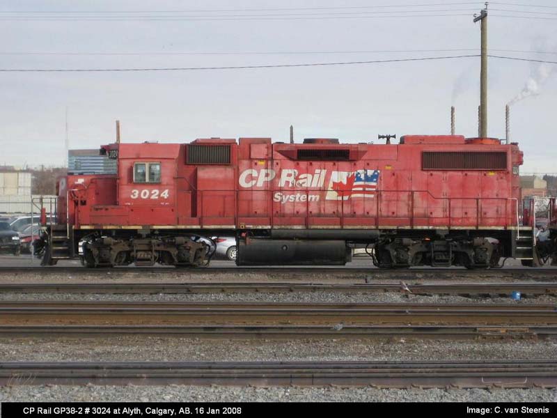 Other Photos (chronological) : 1. CP 3024 at Smiths Falls, ON., painted in the CP Rail Small Multimark paint scheme. Photo by Bill Sanderson, 1991; 2. CP 3024 at Alyth, Calgary AB., painted in the CP Rail Dual Flags paint scheme. Photo by Cor van Steenis, 2008; 3. CP 3024 at Winnipeg, MB., painted in the CP Rail Dual Flags paint scheme. Photo by A. Ross Harrison, 2011; 4. CP 3024 at Winnipeg, MB., painted in the Canadian Pacific paint scheme. Photo by A. Ross Harrison, 2019; 5. CP 3024 at Winnipeg, MB., painted in the Canadian Pacific paint scheme. Photo by A. Ross Harrison, 2019.