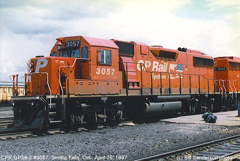 Other Photos (chronological) : 1. CP 3057 at Smiths Falls, ON., painted in the CP Rail Dual Flags paint scheme. Photo by Bill Sanderson, 1997; 2. CP 3057 at Smiths Falls, ON., painted in the CP Rail Dual Flags paint scheme. Photo by Bill Sanderson, 2004; 3. CP 3057 at Winnipeg, MB., painted in the CP Rail Dual Flags paint scheme. Photo by A. Ross Harrison, 2007.