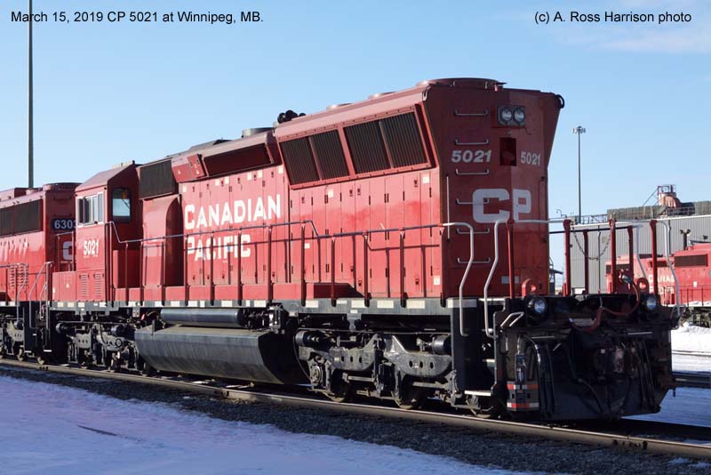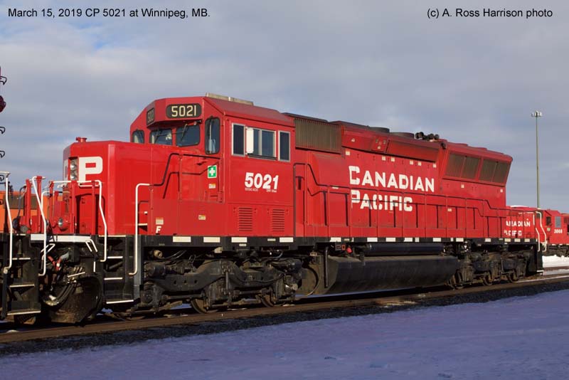 Other Photos (chronological) : 1. CP 5021 at Winnipeg, MB., painted in the Canadian Pacific paint scheme. Photo by A. Ross Harrison, 2018; 2. CP 5021 at Winnipeg, MB., painted in the Canadian Pacific paint scheme. Photo by A. Ross Harrison, 2019; 3. CP 5021 at Winnipeg, MB., painted in the Canadian Pacific paint scheme. Photo by A. Ross Harrison, 2019.