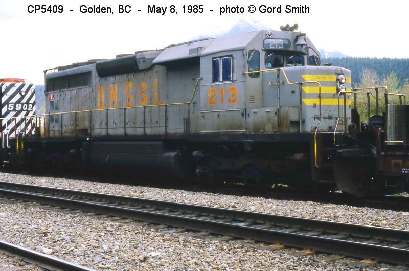 Other Photos (chronological) : 1. QNS&L 213 at Golden, B.C., painted Grey, lettered QNS&L. Photo by Gord Smith, 1985; 2. CP 5409 at Smiths Falls, ON., painted in the CP Rail Small Multimark scheme. Photo by Bill Sanderson, 1985; 3. CP 5409 at Ogden, Calgary AB., painted in the CP Rail no-Multimark paint scheme. Photo by Dale Winkler, 2004.