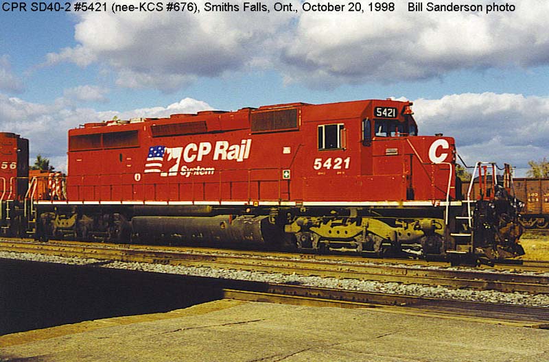 Other Photos (chronological) : 1. CP 676 at Smiths Falls, ON., painted in the Ex-KCS White paint scheme. Photo by Bill Sanderson, 1992; 2. CP 5421 at Smiths Falls, ON., painted in the CP Rail Dual Flags paint scheme. Photo by Bill Sanderson, 1994.