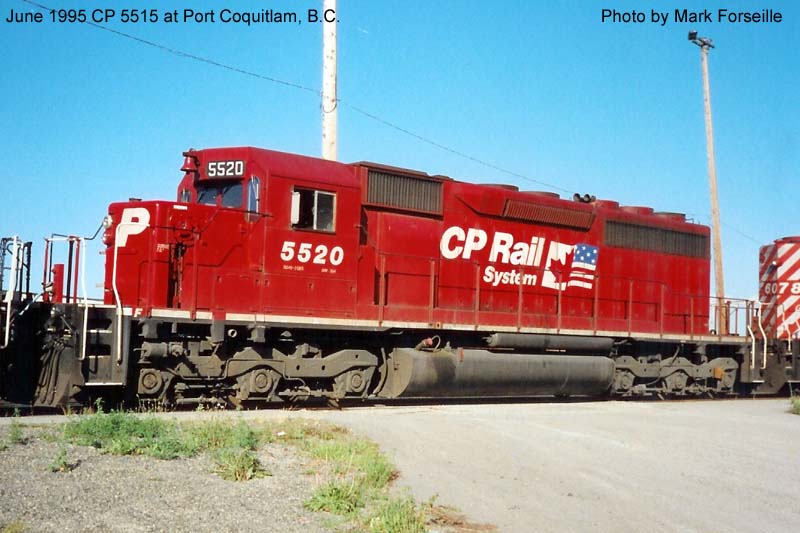 Other Photos (chronological) : 1. CP 5520 at Toronto, ON., painted in the CP Rail Large Multimark paint scheme. Photo by D.W> Hately, 1974. From the Bill Sanderson collection; 2. CP 5520 at Port Coquitlam, B.C., painted in the CP Rail Large Multimark paint scheme. Photo by Claude Prutton, 1976; 3. CP 5520 at Revelstoke, B.C., painted in the CP Rail Dual Flags paint scheme. Photo by Bill Sanderson, 1993; 4. CP 5520 at Port Coquitlam, B.C., painted in the CP Rail Dual Flags paint scheme. Photo by Mark Forseille, 1995; 5. DM&E 6071 at Waseca, MN., painted for Dakota, Minnesota & Eastern. Photo by Tom Farrell, 2003. From the Bill Sanderson collection.