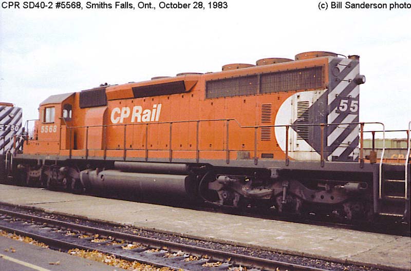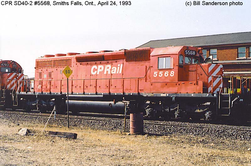Other Photos (chronological) : 1. CP 5568 at Smiths Falls, ON., painted in the CP Rail Small Multimark paint scheme. Photo by Bill Sanderson, 1983; 2. CP 5568 at Smiths Falls, ON., painted in the CP Rail no-Multimark paint scheme. Photo by Bill Sanderson, 1993.