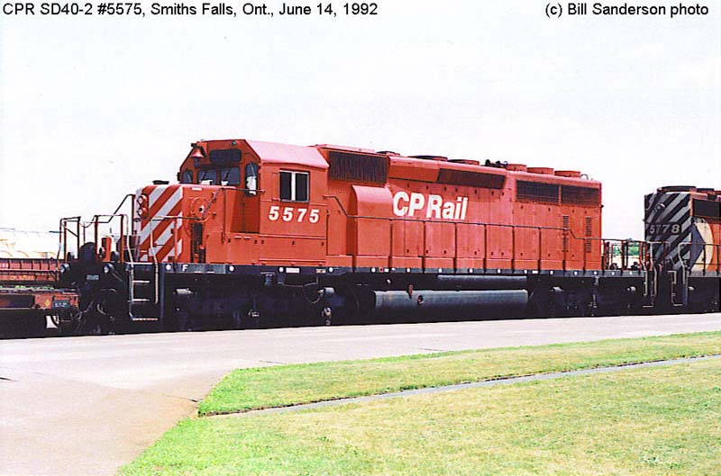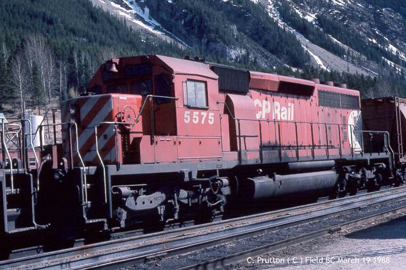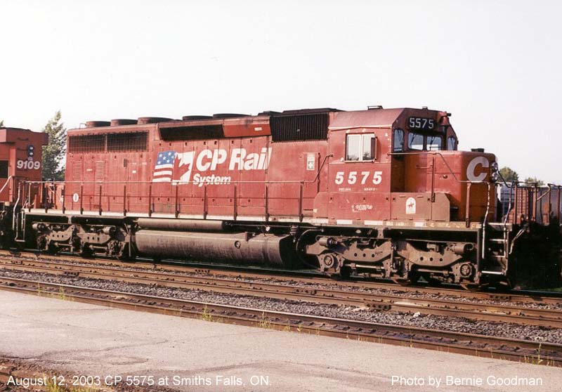Other Photos (chronological) : 1. CP 5575 at Ignace, ON., painted in the CP Rail Large Multimark paint scheme. Photo by George A. LaPray, 1976. From the Bill Sanderson collection; 2. CP 5575 at Smiths Falls, ON., painted in the CP Rail no-Multimark paint scheme. Photo by Bill Sanderson, 1992; 3. CP 5575 at Smiths Falls, ON., painted in the CP Rail Dual Flags paint scheme. Photo by Bernie Goodman, 2003.