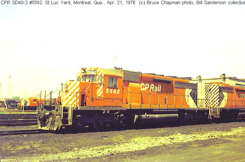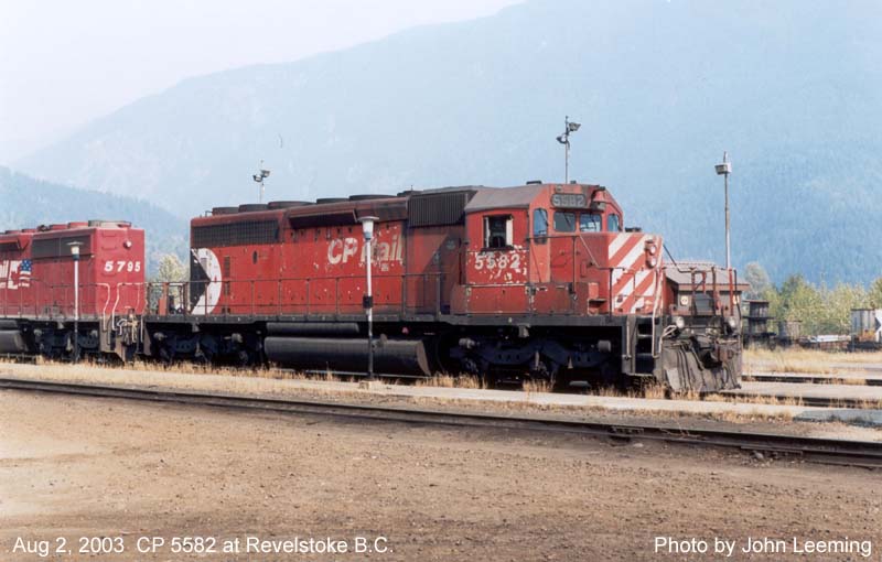 Other Photos (chronological) : 1. CP 5582 at Montreal, QC., painted in the CP Rail Large Multimark paint scheme. Photo by Bruce Chapman, 1976. From the Bill Sanderson collection; 2. CP 5582 at Smiths Falls, ON., painted in the CP Rail Small Multimark paint scheme. Photo by Bill Sanderson, 1989; 3. CP 5582 at Revelstoke, B.C., painted in the CP Rail Small Multimark paint scheme. Photo by John Leeming, 2003.