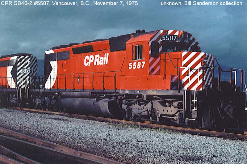 Other Photos (chronological) : 1. CP 5587 at Vancouver, B.C., painted in the CP Rail Large Multimark paint scheme. Photographer unknown, 1975. From the Bill Sanderson collection; 2. CP 5587 at Smiths Falls, ON., painted in the CP Rail Small Multimark paint scheme. Photo by Bill Sanderson, 1985; 3. CP 5587 at Smiths Falls, ON., painted in the CP Rail no-Multimark paint scheme. Photo by Bill Sanderson, 1992.