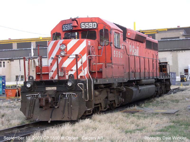 Other Photos (chronological) : 1. CP 5590 at Field, B.C., painted in the CP Rail Large Multimark paint scheme. Photo by Bruce Chapman, 1974. From the Bill Sanderson collection; 2. CP 5590 at Field, B.C., painted in the CP Rail Large Multimark paint scheme. Photo by E.D. Motis, 1978; 3. CP 5590 at Ogden, Calgary AB., painted in the CP Rail no-Multimark paint scheme. Photo by Dale Winkler, 2003.