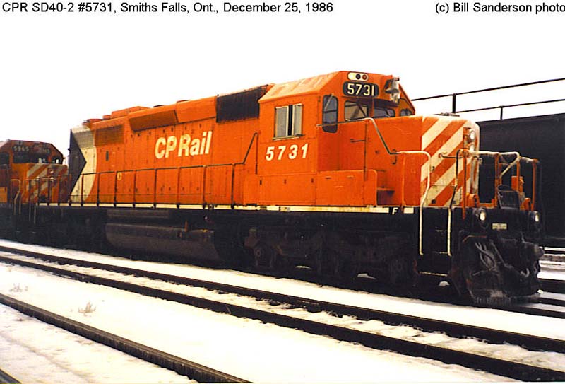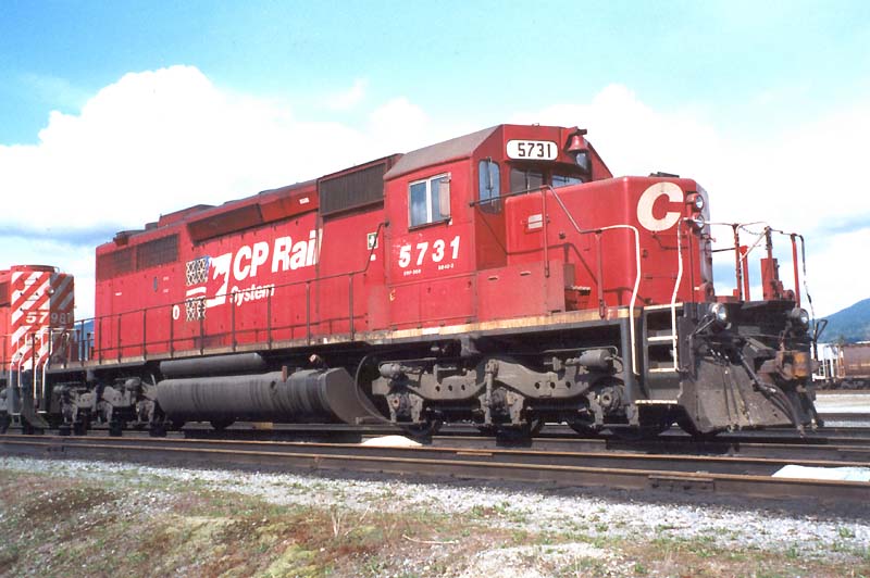 Other Photos (chronological) : 1. CP 5731 at Smiths Falls, ON., painted in the CP Rail Large Multimark paint scheme. Photo by Bill Sanderson, 1986; 2. CP 5731 at Schreiber, ON., painted in the CP Rail no-Multimark paint scheme. Photo by Ross Harrison, 1989. From the Bill Sanderson collection; 3. CP 5731 at North Bend, B.C., painted in the CP Rail Dual Flags paint scheme. Photo by Bill Sanderson, 1998; 4. CP 5731 at Ogden, Calgary AB., painted in the CP Rail Dual Flags paint scheme. Photo by Cor van Steenis, 2008.