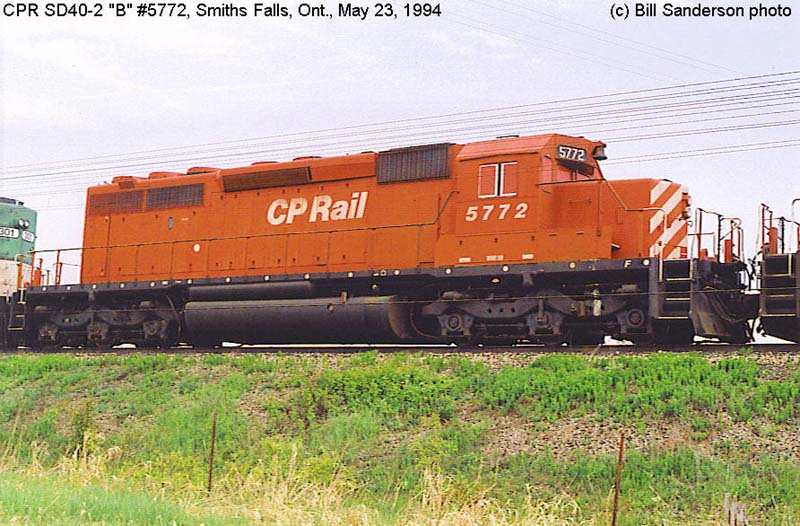 Other Photos (chronological) : 1. CP 5772 at Toronto, ON., painted in the CP Rail Large Multimark paint scheme. Photo by B. Ottaway, 1980. From the Bill Sanderson collection; 2. CP 5772 at Alyth, Calgary AB., painted in the CP Rail no-Multimark paint scheme. Photo by Verne Trevoy, 1987. From the Bill Sanderson collection; 3. CP 5772 at Smiths Falls, ON., converted to B-unit with cab windows blanked out, painted in the CP Rail no-Multimark paint scheme. Photo by Bill Sanderson, 1994; 4. CP 5772 at Smiths Falls, ON., painted in the CP Rail no-Multimark paint scheme. Photo by Bill Sanderson, 1998; 5. CP 5772 at Shepard, Calgary AB., painted in the CPR Beaver paint scheme. Photo by Cor van Steenis, 2008; 6. CP 5772 at Winnipeg, MB., painted in the CPR Beaver paint scheme. Photo by A. Ross Harrison, 2008; 7. CP 5772 at Port Coquitlam, B.C., painted in the CPR Beaver paint scheme. Photo by Mark Forseille, 2011.