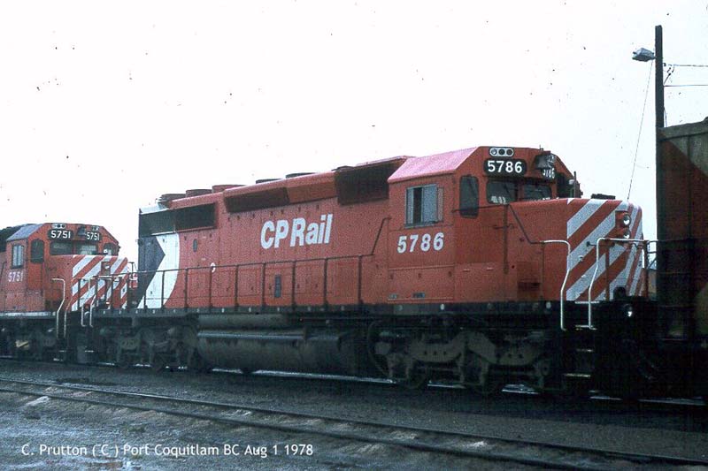 Other Photos (chronological) : 1. CP 5786 at Port Coquitlam, B.C., painted in the CP Rail Large Multimark paint scheme. Photo by Claude Prutton, 1978; 2. CP 5786 at Smiths Falls, ON., painted in the CP Rail no-Multimark paint scheme. Photo by Bill Sanderson, 1989; 3. CP 5397 at Smiths Falls, ON., painted red with basic CP decals. Photo by Bill Sanderson, 2001.