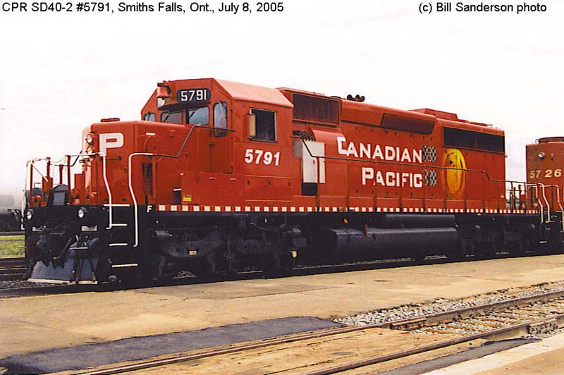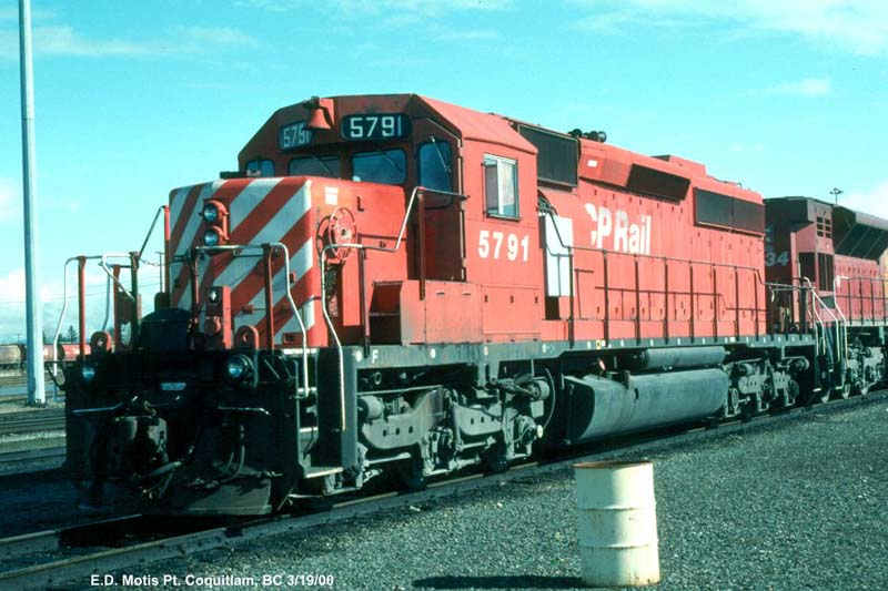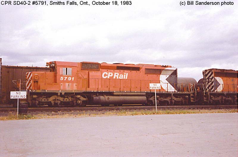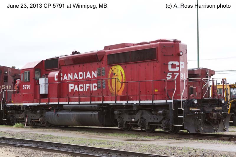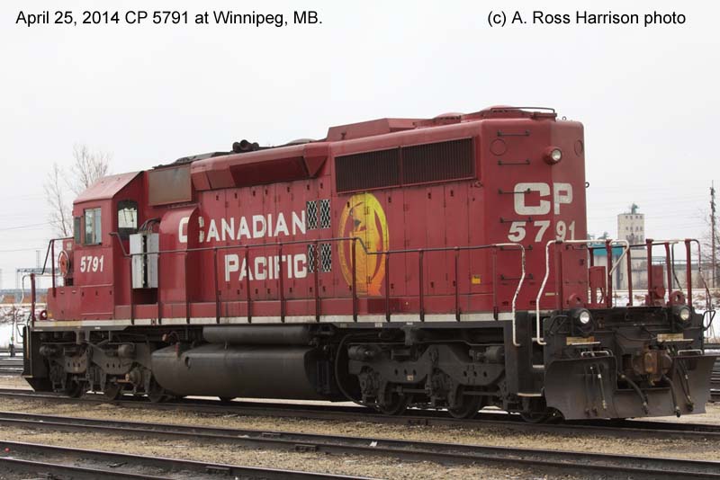 Other Photos (chronological) : 1. CP 5791 at Smiths Falls, ON., painted in the CP Rail Large Multimark paint scheme. Photo by Bill Sanderson, 1983; 2. CP 5791 at Port Coquitlam, B.C., painted in the CP Rail no-Multimark paint scheme. Photo by E.D. Motis, 2000; 3. CP 5791 at Smiths Falls, ON., painted in the CPR Beaver paint scheme. Photo by Bill Sanderson, 2005; 4. CP 5791 at WInnipeg, MB., painted in the CPR Beaver paint scheme. Photo by A. Ross Harrison, 2013; 5. CP 5791 at WInnipeg, MB., painted in the CPR Beaver paint scheme. Photo by A. Ross Harrison, 2014.