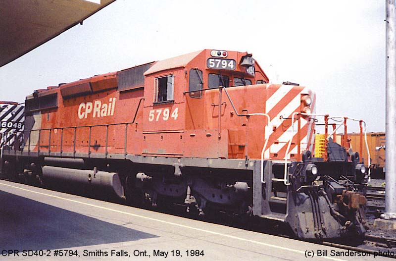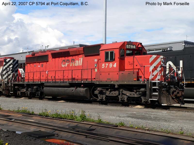 Other Photos (chronological) : 1. CP 5794 at Smiths Falls, ON., painted in the CP Rail Large Multimark paint scheme. Photo by Bill Sanderson, 1984; 2. CP 5794 at Thunder Bay, ON., painted in the CP Rail no-Multimark paint scheme. Photo by Bill Sanderson, 1991; 3. CP 5794 at Port Coquitlam, B.C., painted in the CP Rail no-Multimark paint scheme. Photo by Mark Forseille, 2007.
