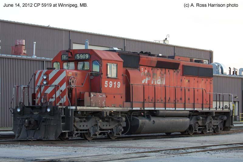Other Photos (chronological) : 1. CP 5919 at Smiths Falls, ON., painted in the CP Rail Small Multimark paint scheme. Photo by Bill Sanderson, 1986; 2. CP 5919 at Smiths Falls, ON., painted in the CP Rail no-Multimark paint scheme. Photo by Bernie Goodman, 1998; 3. CP 5919 at Winnipeg, MB., painted in the CP Rail no-Multimark paint scheme. Photo by A. Ross Harrison, 2012.