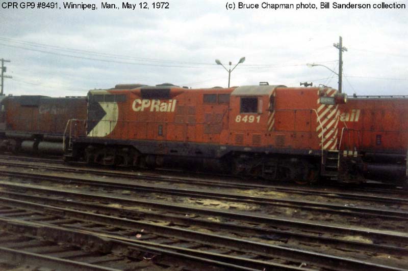 Other Photos (chronological) : 1. CP 8491 at Winnipeg, MB., painted in the CP Rail Large Multimark paint scheme. Photo by Bruce Chapman, 1972. From the Bill Sanderson collection; 2. CP 8491 at Thunder Bay, ON., painted in the CP Rail Small Multimark paint scheme (experimental). Photo by Bruce Chapman, 1977. From the Bill Sanderson collection; 3. CP 1566 at Regina, SK., painted in the CP Rail System paint scheme. Photo by Wilco van Schoonhoven, 2003.