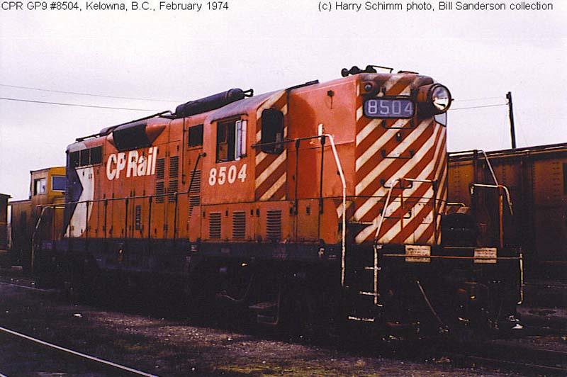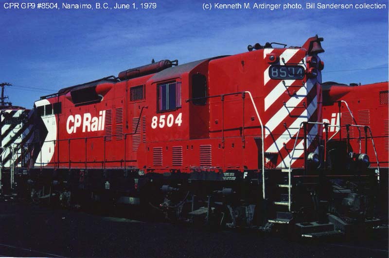 Other Photos (chronological) : 1. CP 8504 at Revelstoke, B.C., painted in the Maroon & Grey "Block" paint scheme. Photo by Bob Loat, 1962. From the Bill Sanderson collection; 2. CP 8504 at Nanaimo, B.C., painted in the CP Rail Large Multimark paint scheme. Photo by Kenneth M. Ardinger, 1979. From the Bill Sanderson collection; 3. CP 1541 at Regina, SK., painted in the CP Rail System paint scheme. Photo by Bill Sanderson, 1997.