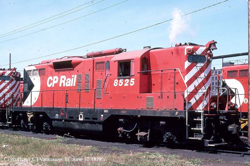 Other Photos (chronological) : 1. CP 8525 at Vancouver, B.C., painted in the Maroon & Grey "Block" paint scheme. Photo by Bob Loat, 1966. From the Bill Sanderson collection; 2. CP 8525 at Calgary, AB., painted in the CP Rail Large Multimark paint scheme. Photo by Bruce Chapman, 1975. From the Bill Sanderson collection; 3. CP 1623 at Alyth, Calgary AB., painted in the CP Rail paint scheme. Photo by Mark Forseille, 2006.