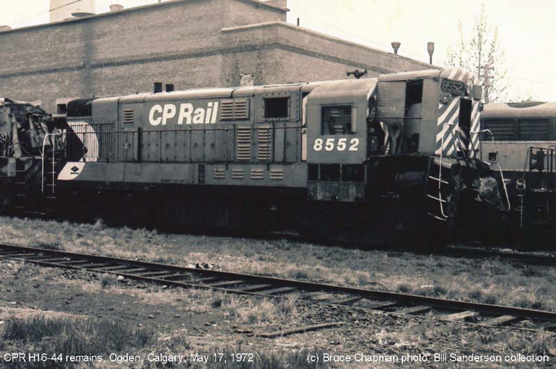 Other Photos (chronological) : 1. The remains of CP 8552 at Ogden, Calgary AB., painted in the CP Rail Small Multimark paint scheme. Photo by Bruce Chapman, 1972. From the Bill Sanderson collection.