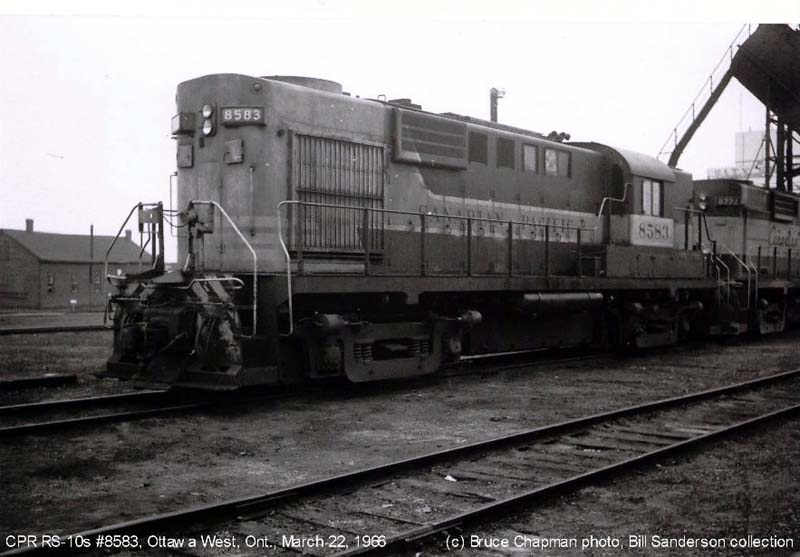 Other Photos (chronological) : 1. CP 8583 at Ottawa, ON., painted in the Maroon & Grey "Block" paint scheme. Photo by Bruce Chapman, 1966. From the Bill Sanderson collection; 2. CP 8583 at Smiths Falls, ON., painted in the Maroon & Grey "Script" paint scheme. Photo by Bruce Chapman, 1966. From the Bill Sanderson collection; 3. CP 8583 at Montreal, QC., painted in the CP Rail Large Multimark paint scheme. Photo by Bruce Chapman, 1979. From the Bill Sanderson collection.