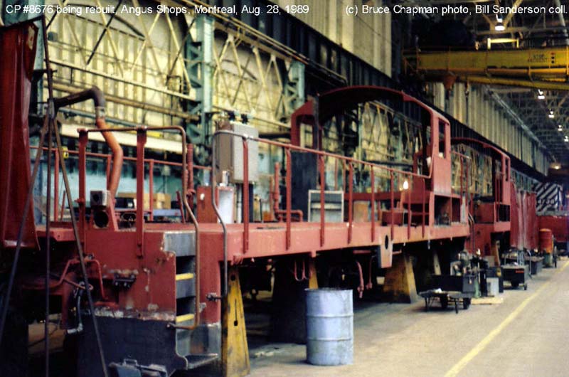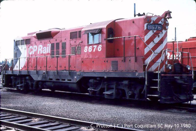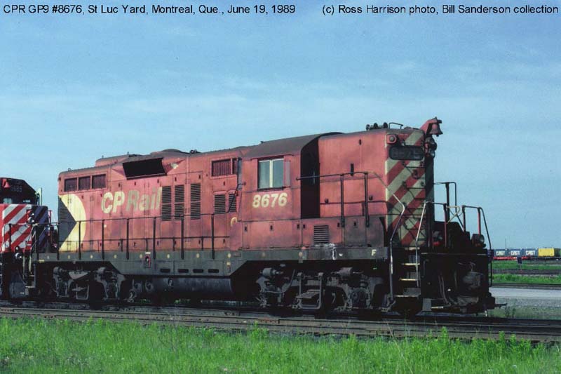 Other Photos (chronological) : 1. CP 8676 at Saskatoon, SK., painted in the CP Rail Large Multimark paint scheme. Photographer unknown, 1975. From the Bill Sanderson collection; 2. CP 8676 at Montreal, QC., painted in the CP Rail Small Multimark paint scheme. Photo by Ross Harrison, 1989. From the Bill Sanderson collection; 3. CP 8676 at Montreal, QC., being rebuilt to GP9u 8224. Photo by Bruce Chapman, 1989. From the Bill Sanderson collection; 4. CP 8224 at Smiths Falls, ON., painted in the CP Rail no-Multimark paint scheme. Photo by Bill Sanderson, 1998.