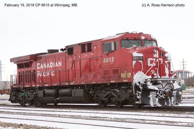 Other Photos (chronological) : 1. CP 8615 at Smiths Falls, ON., painted in the CPR Beaver paint scheme. Photo by Bill Sanderson, 2003; 2. CP 8615 at Winnipeg, MB., painted in the Canadian Pacific paint scheme. Photo by A. Ross Harrison, 2018; 3. CP 8615 at Winnipeg, MB., painted in the Canadian Pacific paint scheme. Photo by A. Ross Harrison, 2018.