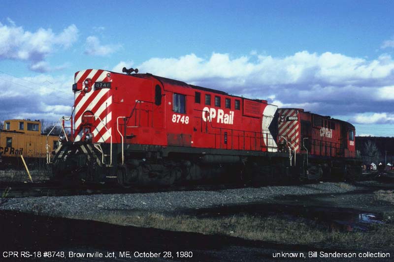Other Photos (chronological) : 1. CP 8748 at Toronto, ON., painted in the Maroon & Grey "Block" paint scheme. Photo by D.W. Hately, 1965. From the Bill Sanderson collection; 2. CP 8748 at Toronto, ON., painted in the Maroon & Grey "Script" paint scheme. Photo by D.W. Hately, 1971. From the Bill Sanderson collection; 3. CP 8748 at Brownville Jct., ME., painted in the CP Rail Large Multimark paint scheme. Photographer unknown, 1980. From the Bill Sanderson collection; 4. CP 1806 at Smiths Falls, ON., painted in the CP Rail Large Multimark paint scheme. Photo by Bill Sanderson, 1984.