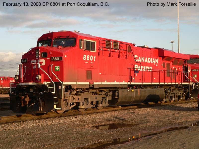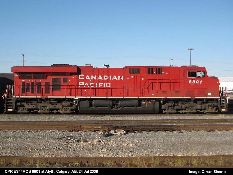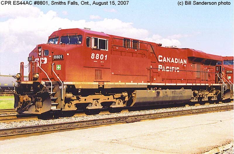 Other Photos (chronological) : 1. CP 8801 at Smiths Falls, ON., painted in the Canadian Pacific paint scheme. Photo by Bill Sanderson, 2007; 2. CP 8801 at Alyth, Calgary AB., painted in the Canadian Pacific paint scheme. Photo by Cor van Steenis, 2008.