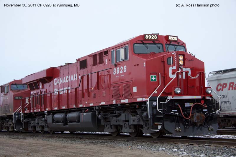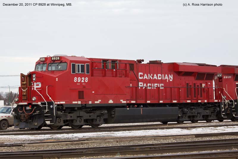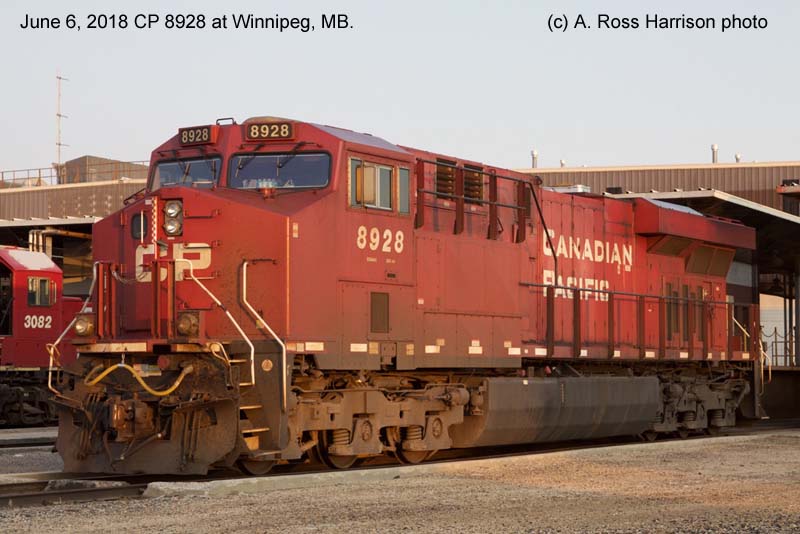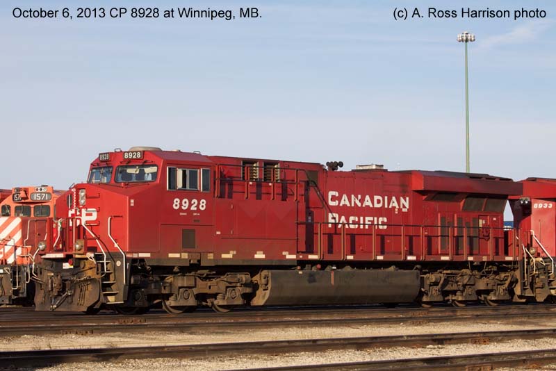Other Photos (chronological) : 1. CP 8928 at Winnipeg, MB., painted in the Canadian Pacific paint scheme. Photo by A. Ross Harrison, 2011; 2. CP 8928 at Winnipeg, MB., painted in the Canadian Pacific paint scheme. Photo by A. Ross Harrison, 2013; 3. CP 8928 at Winnipeg, MB., painted in the Canadian Pacific paint scheme. Photo by A. Ross Harrison, 2018.