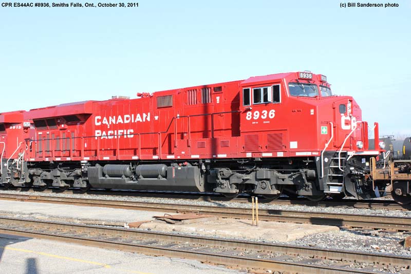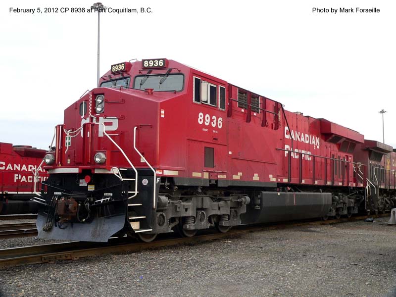 Other Photos (chronological) ; 1. CP 8936 at Smiths Falls, ON., painted in the Canadian Pacific paint scheme. Photo by Bill Sanderson, 2011; 2. CP 8936 at Port Coquitlam, B.C., painted in the Canadian Pacific paint scheme. Photo by Mark Forseille, 2012.