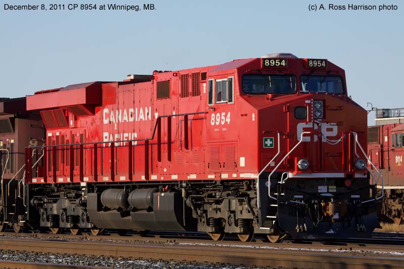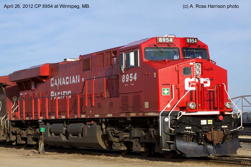 Other Photos (chronological) : 1. CP 8954 at Winnipeg, MB., painted in the Canadian Pacific paint scheme. Photo by A. Ross Harrison, 2012.