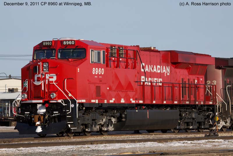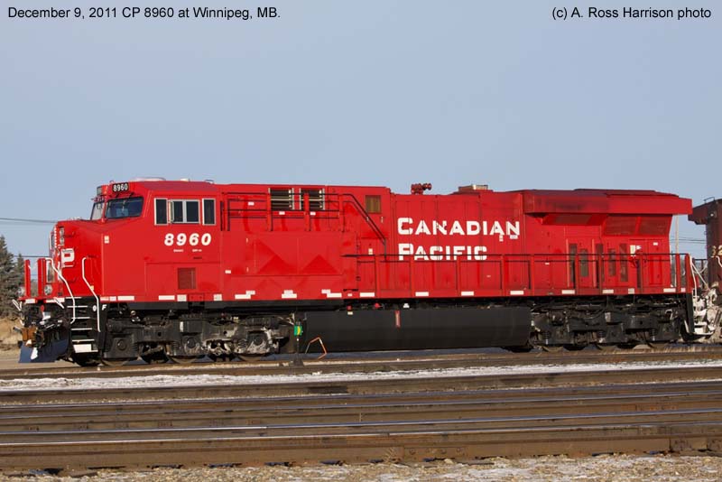 Other Photos (chronological) : 1. CP 8960 at Winnipeg, MB., painted in the Canadian Pacific paint scheme. Photo by A. Ross Harrison, 2011; 2. CP 8960 at Winnipeg, MB., painted in the Canadian Pacific paint scheme. Photo by A. Ross Harrison, 2011.