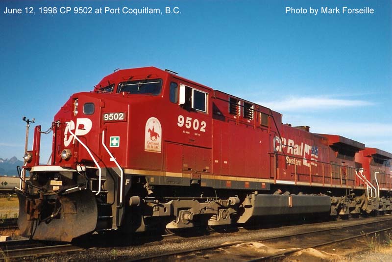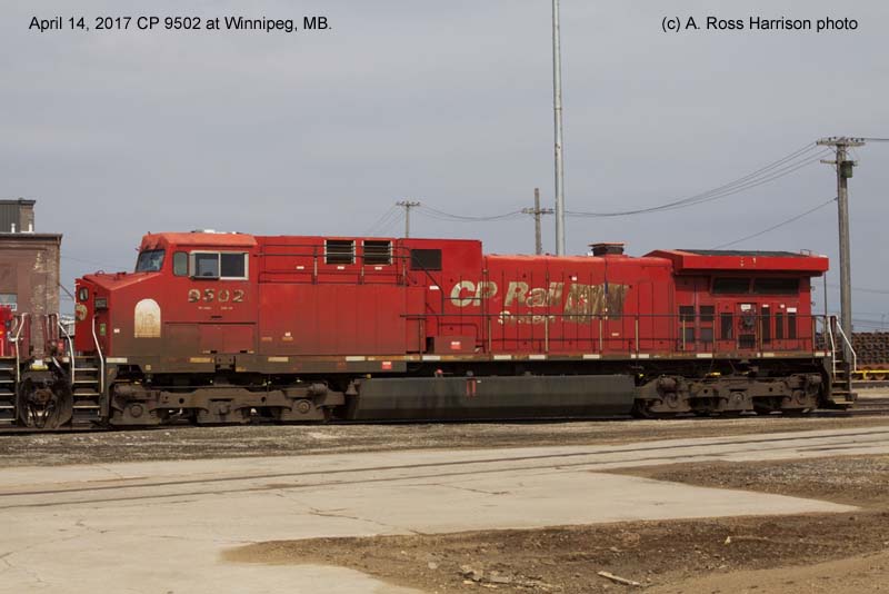 Other Photos (chronological) : 1. CP 9502 at Port Coquitlam, B.C., painted in the CP Rail Dual Flags paint scheme. Photo by Mark Forseille, 1998; 2. CP 9502 at Winnipeg, MB., painted in the CP Rail Dual Flags paint scheme. Photo by A. Ross Harrison, 2017; 3. CP 9502 at Winnipeg, MB., painted in the CP Rail Dual Flags paint scheme. Photo by A. Ross Harrison, 2017.