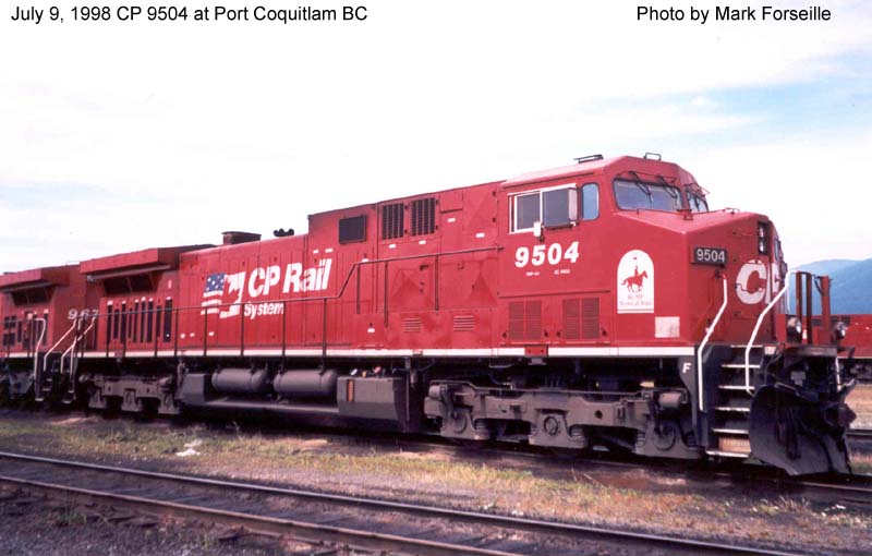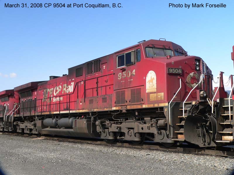 Other Photos (chronological) : 1. CP 9504 at Port Coquitlam, B.C., painted in the CP Rail Dual Flags paint scheme. Photo by Mark Forseille, 2008.