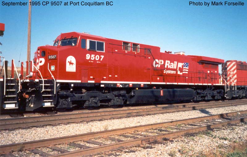 Other Photos (chronological) : 1. CP 9507 at Port Coquitlam, B.C., painted in the CP Rail Dual Flags paint scheme. Photo by Mark Forseille, 1995; 2. CP 9507 at Port Coquitlam, B.C., painted in the CP Rail Dual Flags paint scheme. Photo by Mark Forseille, 2005; 3. CP 8002 at Winnipeg, MB., painted in the CPR Beaver II paint scheme. Photo by A. Ross Harrison, 2018.