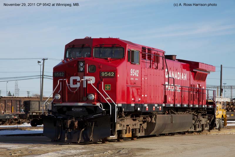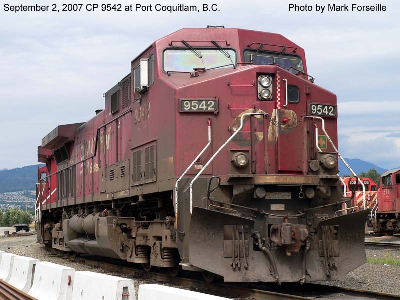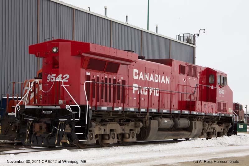 Other Photos (chronological) : 1. CP 9542 at Revelstoke, B.C., painted in the CP Rail Dual Flags paint scheme. Photo by Bill Sanderson, 1996; 2. CP 9542 at Port Coquitlam, B.C., painted in the CP Rail Dual Flags paint scheme. Photo by Mark Forseille, 2007; 3. CP 9542 at Winnipeg, MB., painted in the Canadian Pacific paint scheme. Photo by A. Ross Harrison, 2011; 4. CP 9542 at Winnipeg, MB., painted in the Canadian Pacific paint scheme. Photo by A. Ross Harrison, 2011.