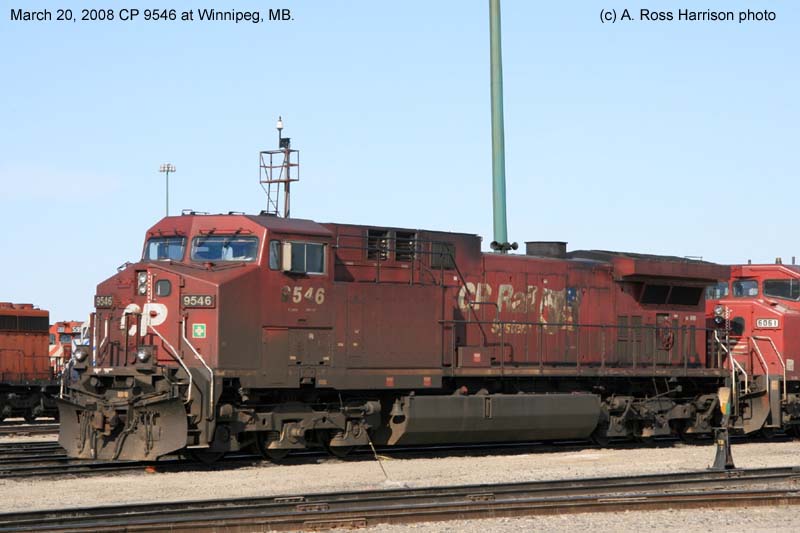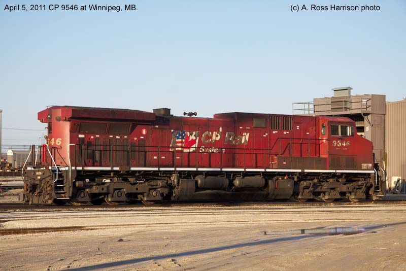 Other Photos (chronological) : 1. CP 9546 at Winnipeg, MB., painted in the CP Rail Dual Flags paint scheme. Photo by A. Ross Harrison, 2008; 2. CP 9546 at Winnipeg, MB., painted in the CP Rail Dual Flags paint scheme. Photo by A. Ross Harrison, 2011.