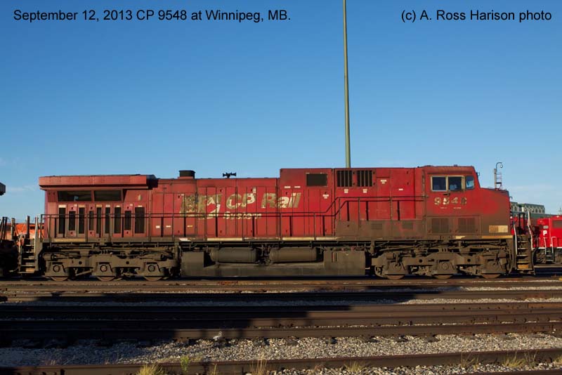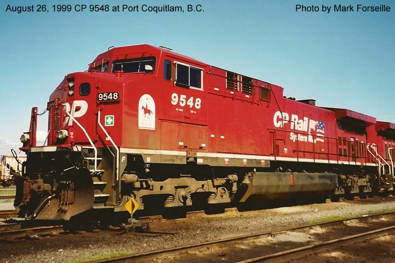 Other Photos (chronological) : 1. CP 9548 at Revelstoke, B.C., painted in the CP Rail Dual Flags paint scheme. Photo by Bill Sanderson, 1996; 2. CP 9548 at Port Coquitlam, B.C., painted in the CP Rail Dual Flags paint scheme. Photo by Mark Forseille, 2007; 3. CP 9548 at Winnipeg, MB., painted in the CP Rail Dual Flags paint scheme. Photo by A. Ross Harrison, 2013; 4. CP 8012 at Winnipeg, MB., painted in the CPR Beaver II paint scheme. Photo by A. Ross Harrison, 2019.