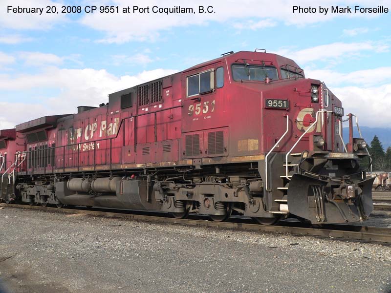 Other Photos (chronological) : 1. CP 9551 at Revelstoke, B.C., painted in the CP Rail Dual Flags paint scheme. Photo by W. van Schoonhoven, 2004; 2. CP 9551 at Port Coquitlam, B.C., painted in the CP Rail Dual Flags paint scheme. Photo by Mark Forseille, 2008.