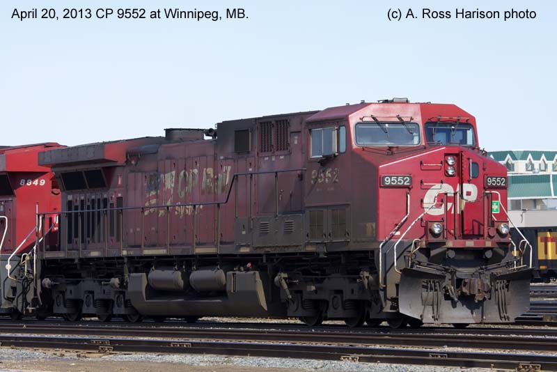 Other Photos (chronological) : 1. CP 9552 at Field, B.C., painted in the CP Rail Dual Flags paint scheme. Photo by Bill Sanderson, 1998; 2. CP 9552 at Winnipeg, MB., painted in the CP Rail Dual Flags paint scheme. Photo by A. Ross Harrison, 2009; 3. CP 9552 at Winnipeg, MB., painted in the CP Rail Dual Flags paint scheme. Photo by A. Ross Harrison, 2013 4. CP 8014 at Pitt Meadows, B.C., painted in the CPR Beaver II paint scheme. Photo by Mark Forseille, 2019.
